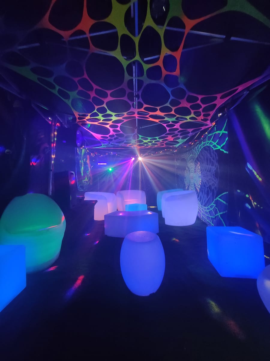 Our Party Tent is fully customized and decorated to stand out, featuring UV reactive large banners, green stretchy funky roof décor, and a UV 400 Watt cannon that brings the package to life at night. Perfect for a variety of events including kids' parties, adult gatherings, communions, confirmations, and major birthdays such as 16th, 18th, 21st, 30th, and 40th celebrations, our UV Party Tent offers an experience that everyone can enjoy.