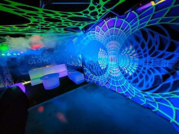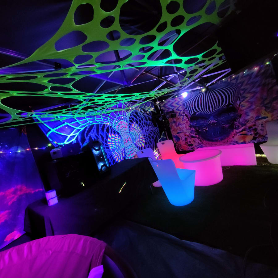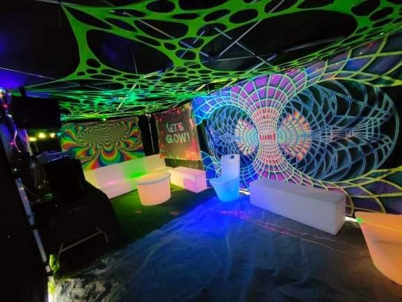 Welcome to our family-run business located in Culloville. Introducing our mesmerizing and fully custom UV Rave Party Tent Package, designed to impress your guests with a unique and unforgettable experience.