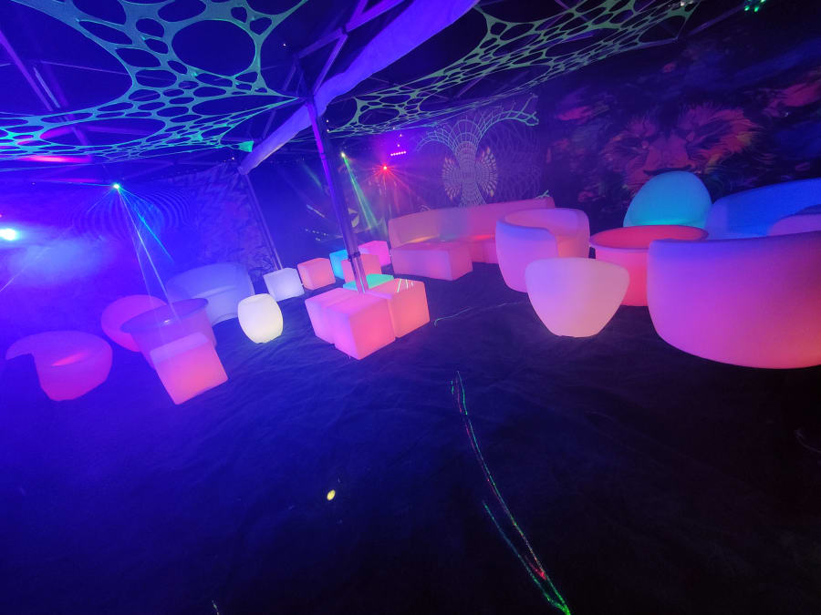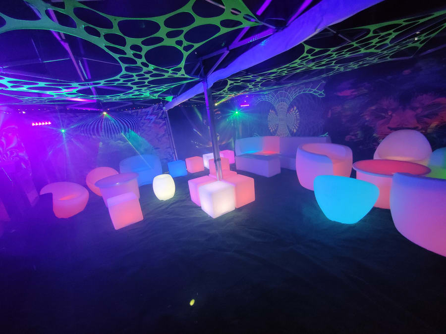Here we have the spectacular 6 m × 6 m UV theme party tent, this setup is for the ultimate party .Wow all your guests with this unique party theme like nowhere else.The party tent is suitable for children and adults and can hold up the 50 guests comfortably this can be used for communions, confirmations ,birthday parties and also wedding after parties.With the 6mx6m commercial grade gazebo it is suitable for any weather. The LED furniture is a huge hit which has battery life up to eight to ten hours