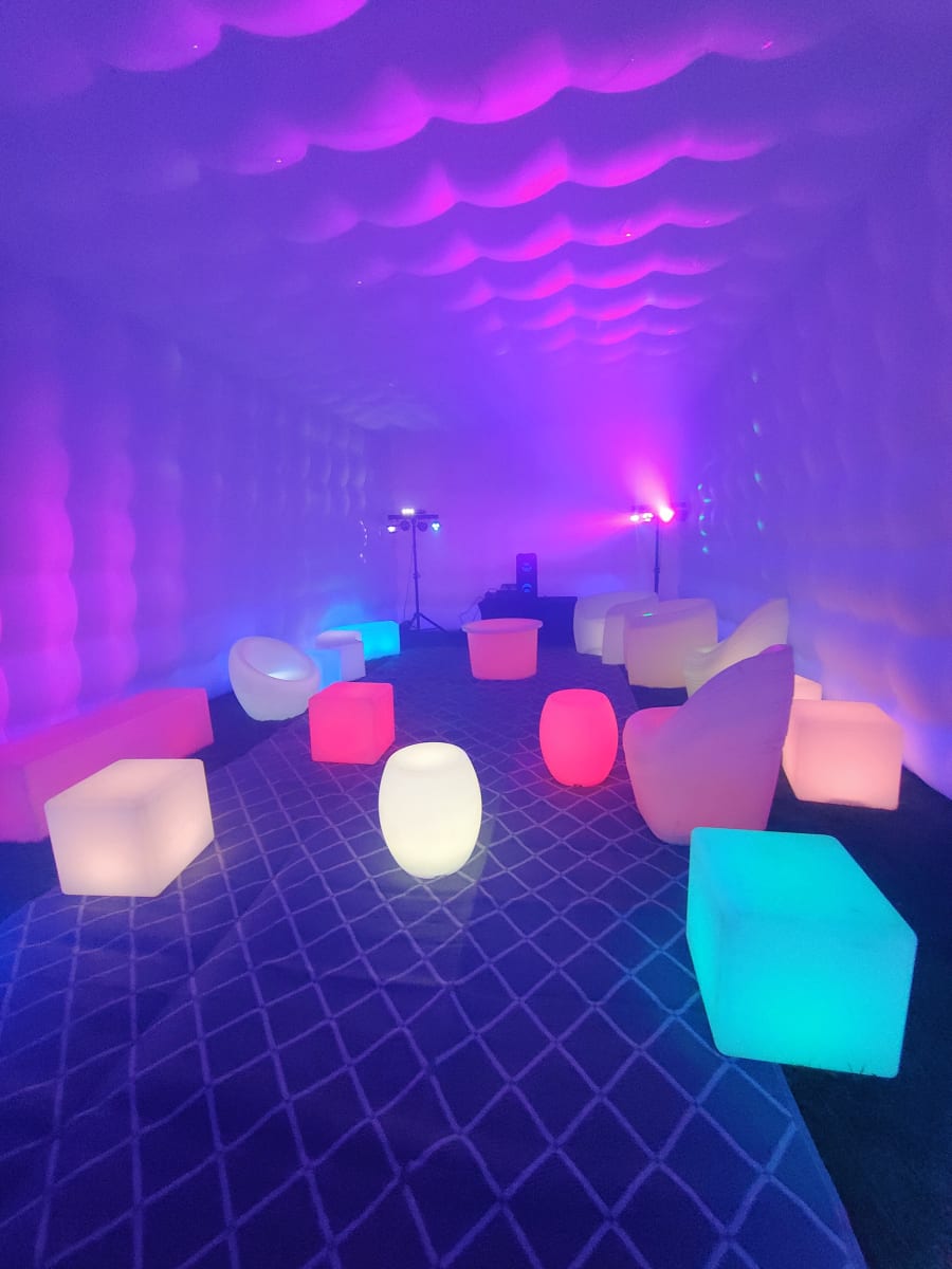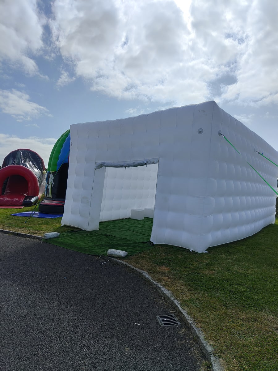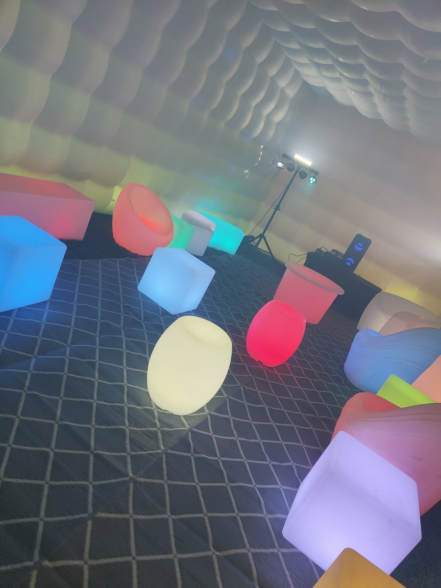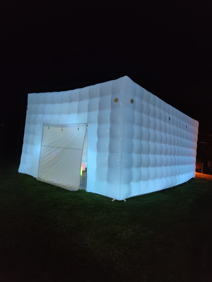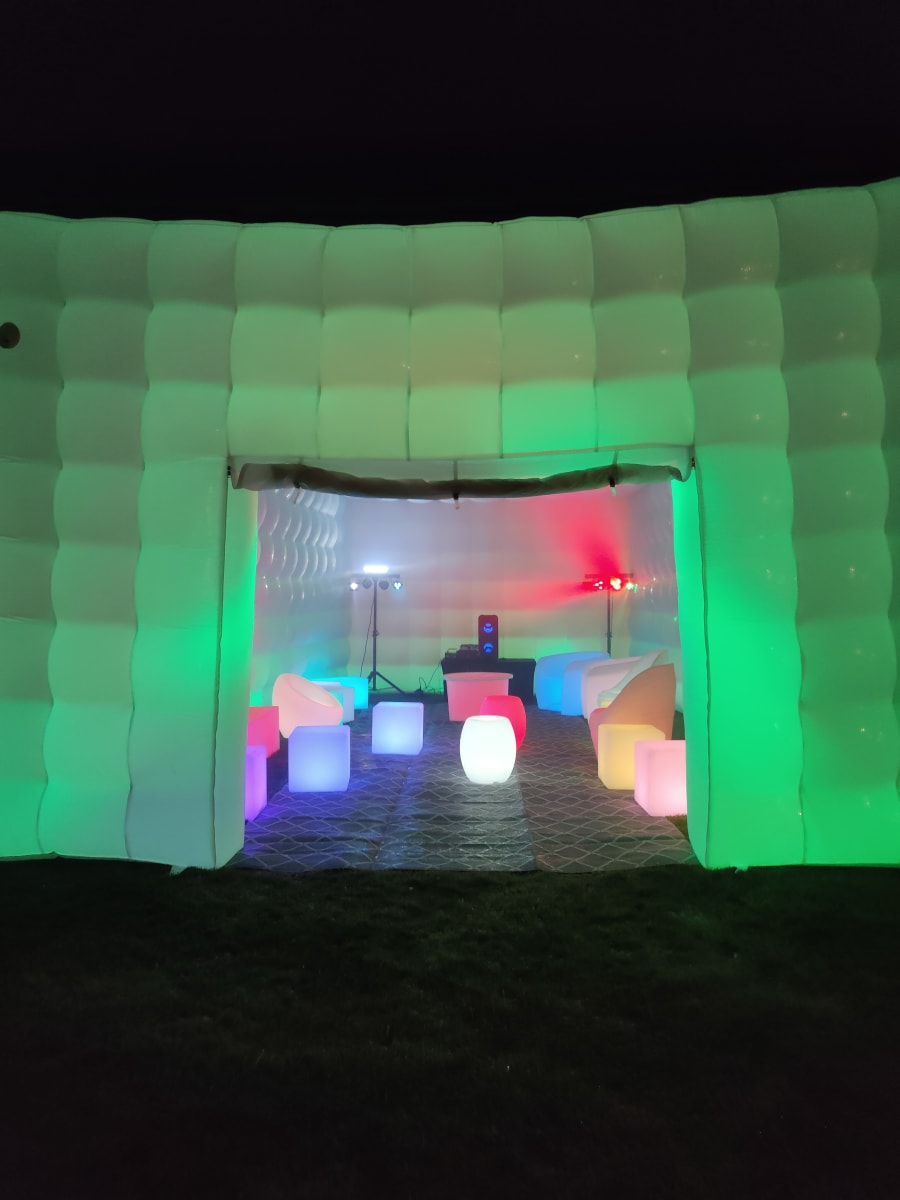Are you considering hosting a memorable party this year? Picture the delight on your guests' faces when they arrive at your very own back garden and are greeted by an inflatable nightclub setting. Our versatile cube is suitable for all ages, perfect for kid and adult parties alike. It's a hit at events like birthday parties, communions, confirmations, gender reveals, and even hen and stag parties. The LED Cube truly comes alive at night, boasting built-in LED lights that illuminate the entire cube, changing colors and creating a mesmerizing spectacle visible from afar. Measuring 5m x 8m, the cube can comfortably accommodate up to 50 guests. Opt for the full package, which includes artificial grass to cover the ground. Additionally, we offer a range of vibrant LED furniture that comes to life at night, a Bluetooth speaker for connecting your preferred music, DJ Disco Lights with automated motion, and a smoke machine to enhance the visual effects. If you're aiming to awe your friends, this is the ultimate solution. Bookings are based on a 24-hour hire and require a grass surface. If you have a concrete area, it must be well sheltered, with a possibility of cancellation in adverse weather conditions. We serve areas including Louth, Monaghan, Cavan, Armagh, and parts of Down. For locations beyond our usual delivery area, we offer delivery with an additional charge up to a maximum distance of 1 hour 30 minutes. Feel free to reach out with any questions before booking. Please note, the cube is only showerproof. Delivery to Dublin and Belfast is available upon request."